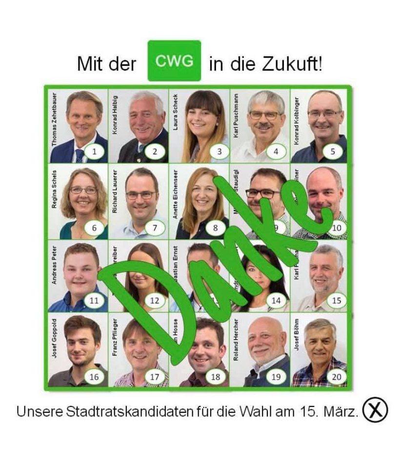 Die CWG Riedenburg sagt Danke für das Vertrauen, dass Sie uns am 15. März entgegengebracht haben. Es zeigt uns, dass wir mit unseren Themen und einem sachbezogenen Wahlkampf die Wählerinnen und Wähler angesprochen haben. Wir werden als CWG Stadtratsfraktion alles daran setzen, Riedenburg in den nächsten sechs Jahren weiter nach vorne zu bringen.