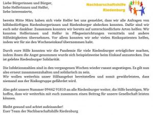 Sie können die Riedenburger Nachbarschaftshilfe unter der Nummer 09442 91810 zu jeder Zeit erreichen. Ein großes Dankeschön an das gesamte Team der Nachbarschaftshilfe Riedenburg. Ihr