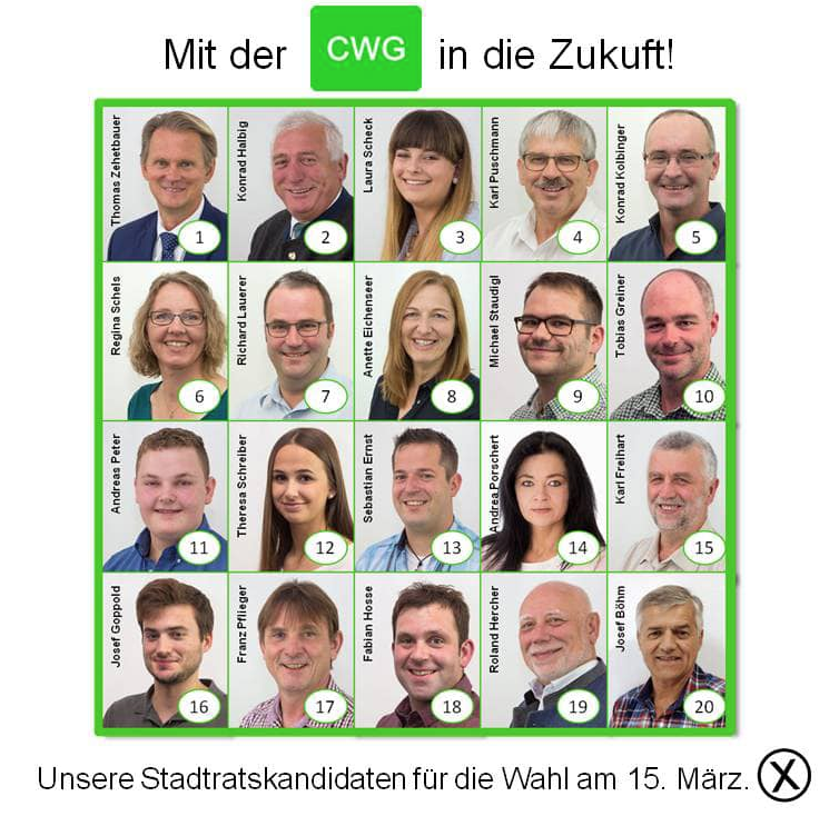 Nachdem wir Ihnen unsere Kandidaten der CWG Stadtratsliste einzeln vorgestellt haben, wollen wir heute noch einmal einen Überblick über alle CWG Kandidatinnen und Kandidaten geben.